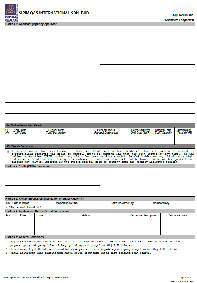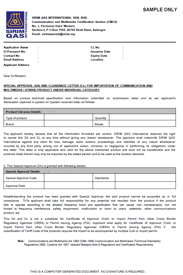 Termasuk jika produk tersebut digunakan untuk kegunaan individu, pameran dan Pembangunan dan Penyelidikan. Sebelum dibolehkan menjual produk tersebut di pasaran Malaysia, produk anda mestilah mempamerkan SIRIM-ST stiker yang diperolehi apabila anda berjaya mendapat kelulusan melalui SIRIM Product Certification/Batch Certification.